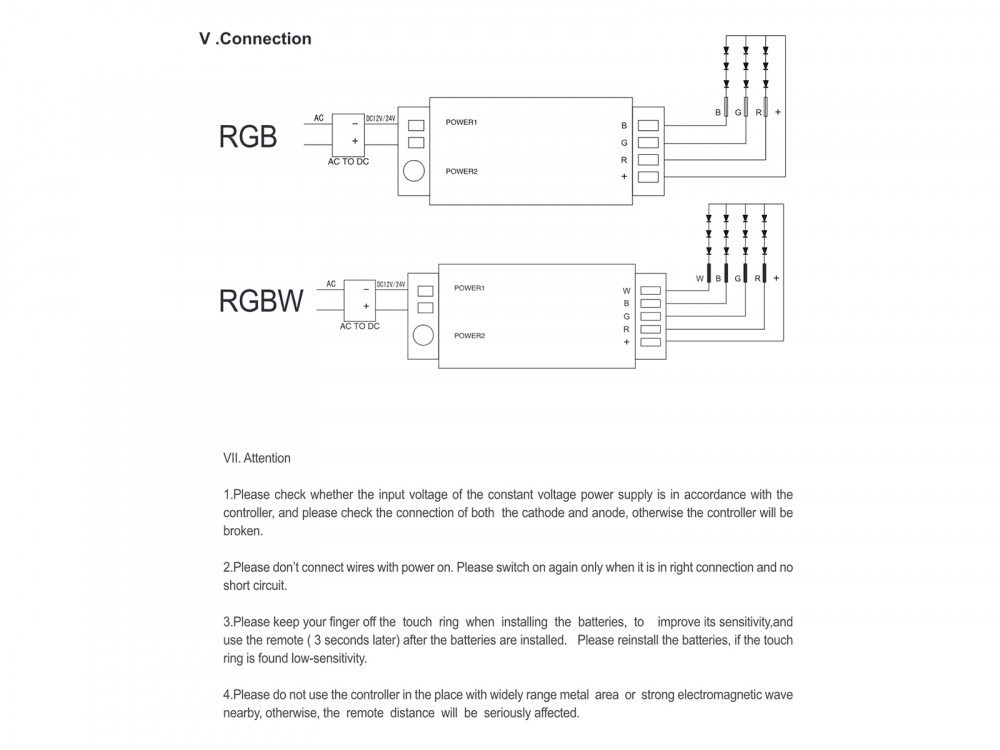 A nagyítható képeken megtekintheti, hogy milyen módon kell csatlakoztatni az RGB csoport vezérlőket a tápegységekhez, illetve a LED fényforrásokhoz. Az RGB zóna vezérlőn két feszültség bemenet is helyet kapott, melyből csak az egyiket kell használni: sorkapcsos bekötés vagy a hagyományos 5.5x2.1 mm-es DC csatlakozó. A vezérlők között fizikai összeköttetésre nincs szükség, a távirányító külön kapcsolódik minden vezérlőhöz. A vezérlők teljesítményét LED jelerősítővel tovább lehet növelni.