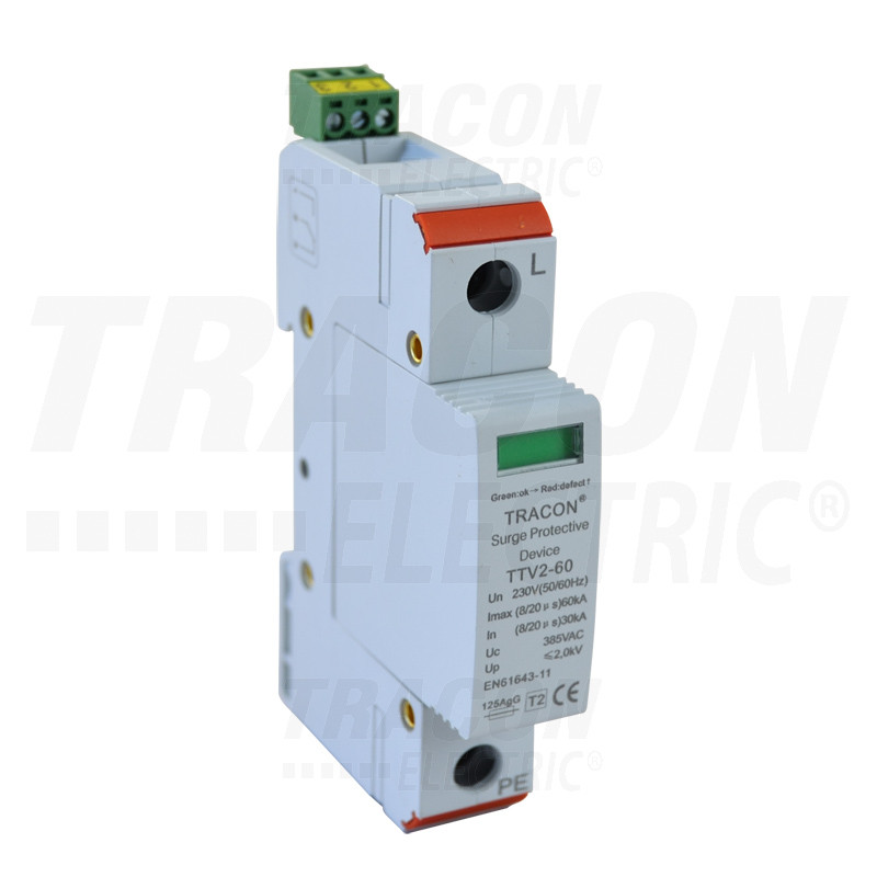 Tracon AC túlfeszültség levezető, 2-es típus, cserélhető betéttel 230 V, 50 Hz, 30/60 kA (8/20 us), 1P